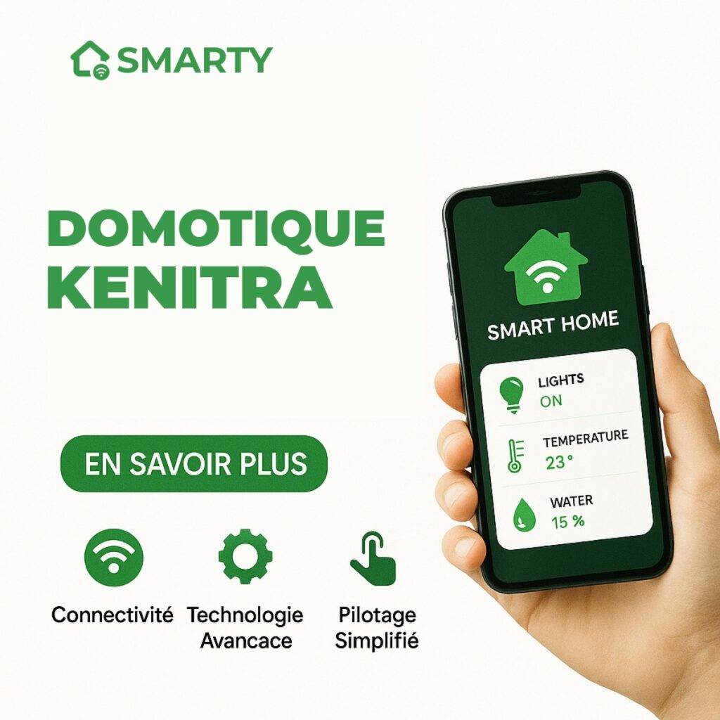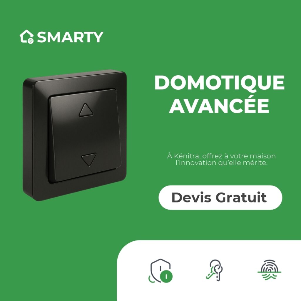 Chez Smarty Maroc, nous nous engageons à offrir les meilleures solutions de domotique à Kénitra, vous positionnant ainsi en tant que leader dans l’installation de systèmes intelligents. Notre équipe d’experts est spécialisée dans l’intégration de dispositifs de sécurité intelligente et d’automatisation de la maison, garantissant à nos clients un environnement à la fois sécurisé et confortable. Que ce soit pour des caméras de surveillance, des détecteurs de fumée, ou même des systèmes de contrôle d’accès, nous avons les solutions adaptées pour répondre à tous vos besoins. Grâce à notre expertise, nous vous garantissons un service d’installation rapide et fiable, en utilisant des technologies de pointe pour la sécurité et le contrôle de la maison.